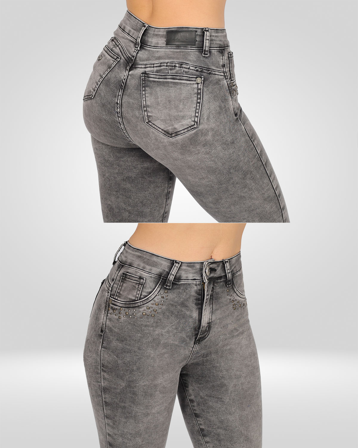 Jeans Gris Corte SkinnyEl pitillo gris con aplicaciones en bolsillos que destaca para un look moderno y atractivo.